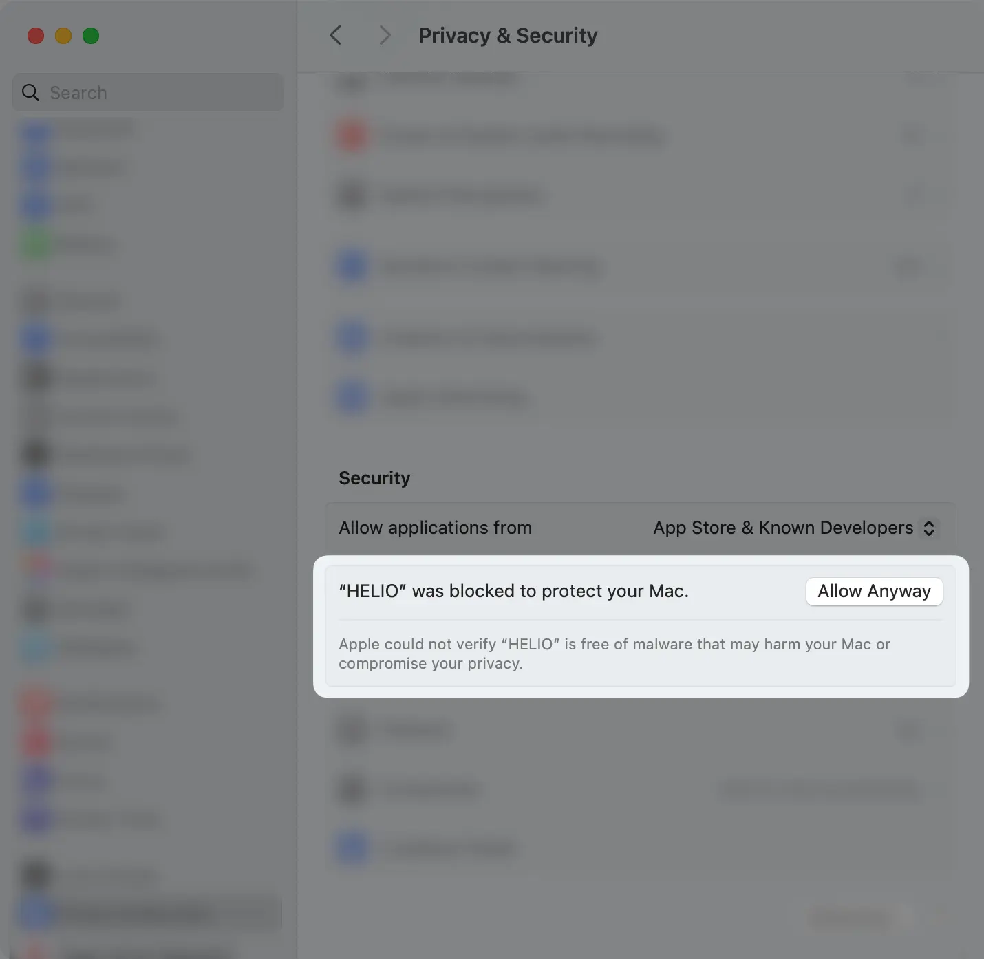 When executing HELIO for the first time, macOS might warn you that HELIO cannot be started since the executable is not yet verified.