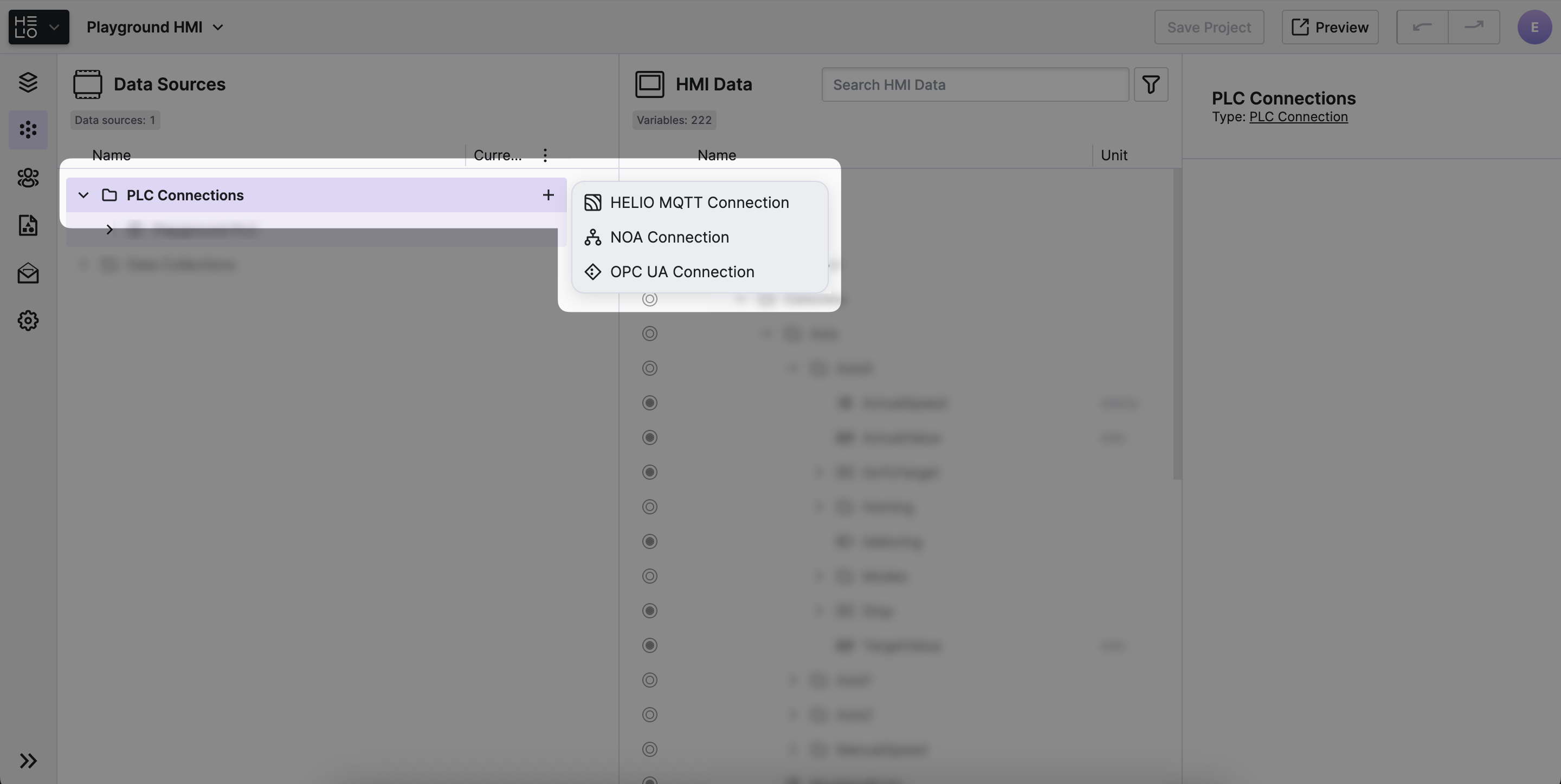 HELIO can connect to different Data Source Types. For HMIs, the PLC Connection is the most important, as it allows you to connect to your PLC using standardized protocols. In this guide, we're gonna mainly focus on OPC UA, because it's pretty popular and widely accepted.