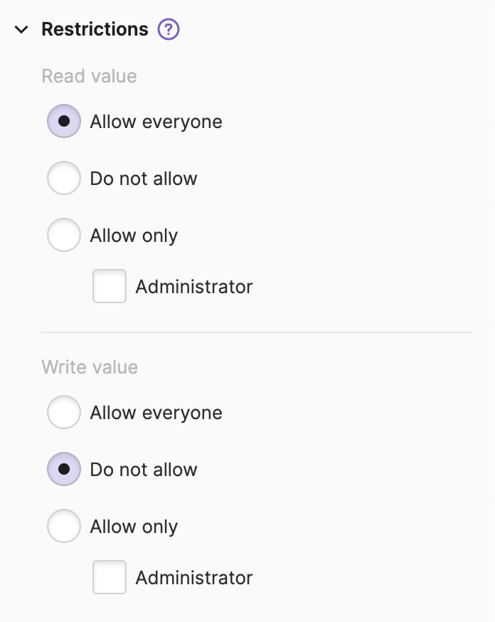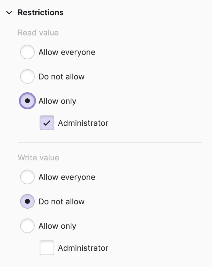 Go to the Data View and locate the HMI Data Explorer. Select the variable you would like to manipulate and locate the Restrictions property group on the right.