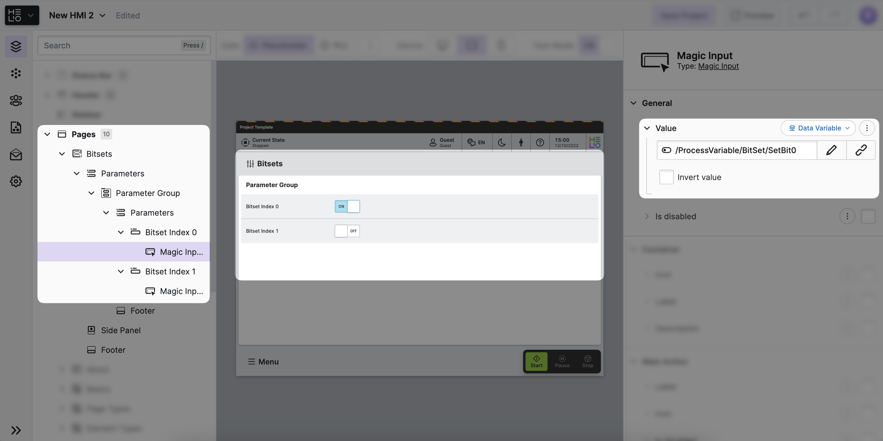 Next we're gonna need two Magic Input elements so we can toggle our Boolean simulation variables we imported into our HMI in a previous step.