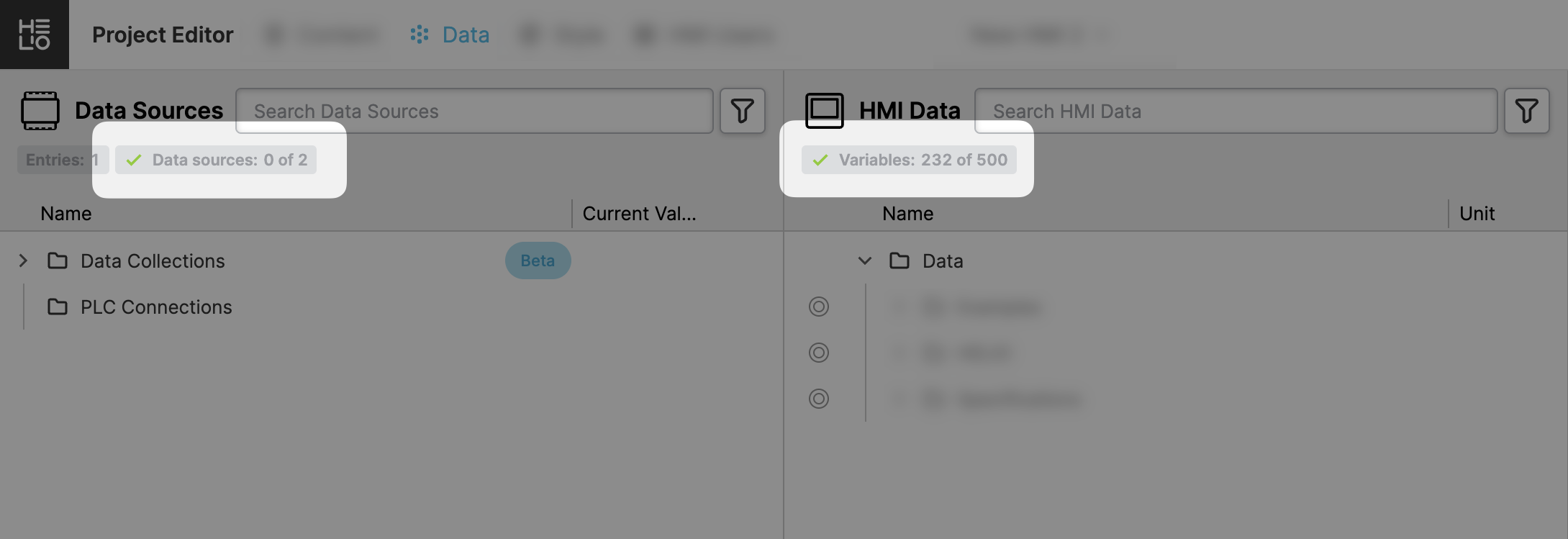 Open your project using the Project Editor and navigate to the Data View. You can find both, the count of data sources as well as variables at the top the Data Source Explorer and HMI Data Explorer.