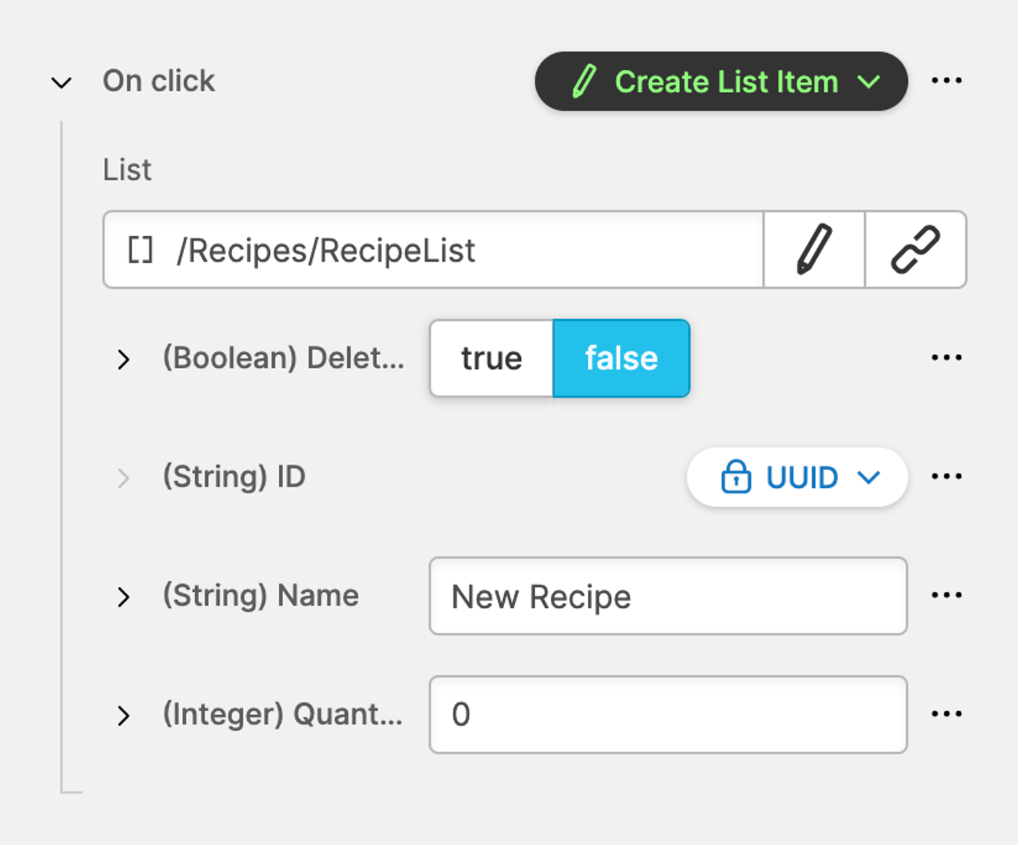 In this example, the Click event triggers an action that creates a new entry in the /Recipes/RecipesList list. The specified values are used to populate the properties of the new item.