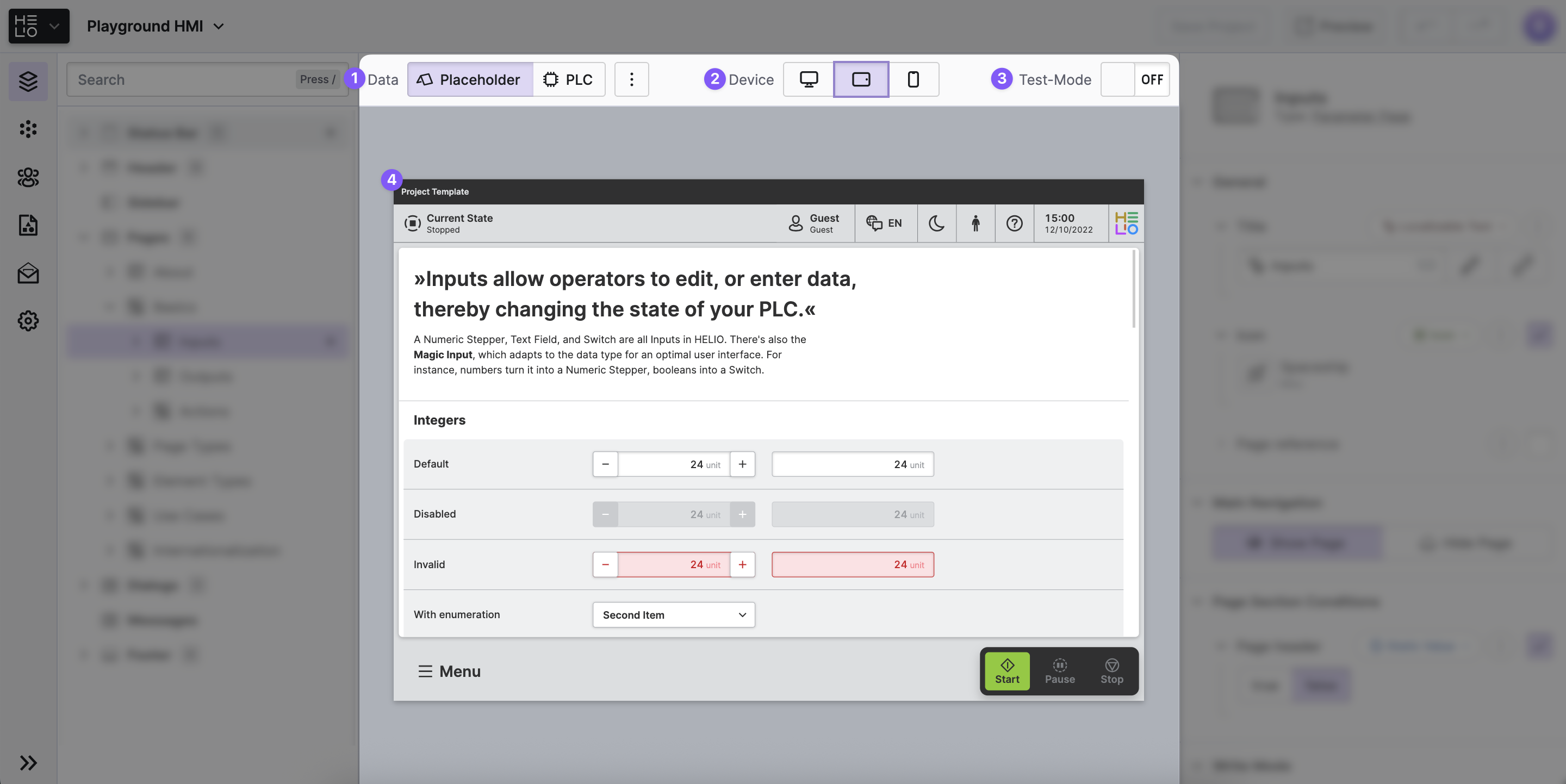 When Placeholder Mode is active, HELIO does not connect to data sources. Instead, it displays the Placeholders that you have defined for your HMI data. This makes it the perfect mode for working without access to the PLC. For more information on how to define placeholders, please refer to Placeholders.