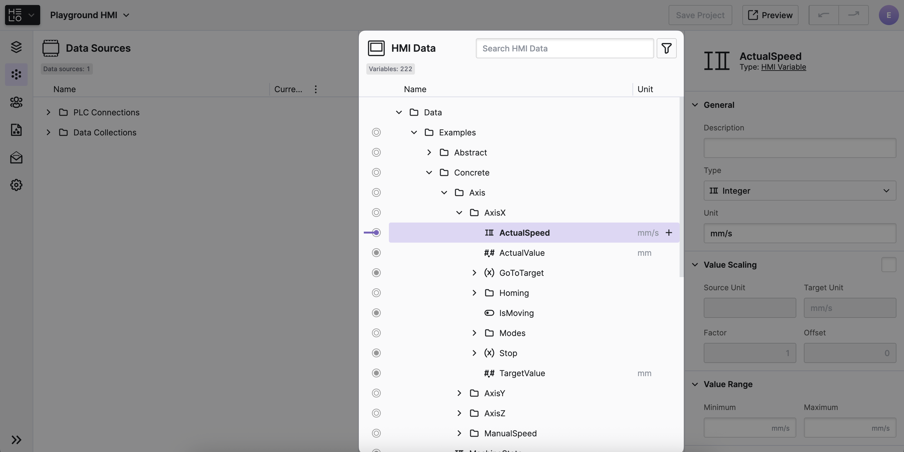 You can also define the data model inside the HMI first, and then link it to a data source later. If you want to learn more, explore the Building HMIs Without a PLC guide. Check out Data Variable Types for more details.